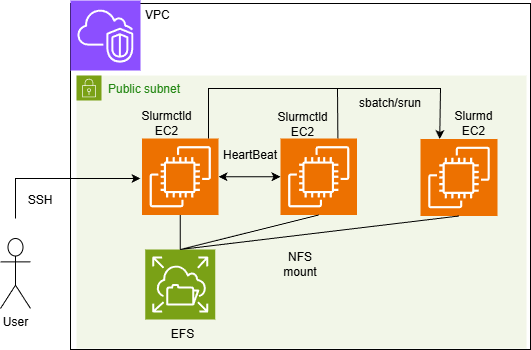 上図において、「Slurmctld」と記載のあるEC2が管理ノードとなります。これらのノード間でHeartbeatを監視し、主系として動作する一方のSlurmctldがDownした際に、待機系として動作する他方のSlurmctldに処理を引き継ぐことを確認します。また、引継ぎ処理の間に計算ノードである「Slurmd」上で実行されているジョブが継続していることも確認する必要があります。